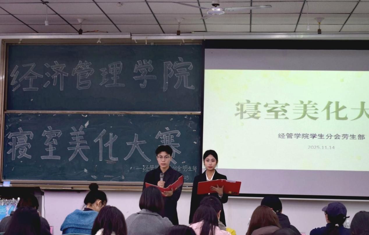 本网讯(文/牛思婷、杨礼冰 图/陈佳敏、阿力么你扎)11月14日中午,经济管理学院于行知楼225室开展寝室美化大赛。经济管理学院辅导员陈聪、张金秋和郭旭,辅导员助理李霖燚,新闻传媒中心主任尹良芹,分团委副书记汪豪杰、陈友煜,学生分会主席伍晓敏以及副主席胡玉霞组成评委团,对2025级参赛寝室进行评审。